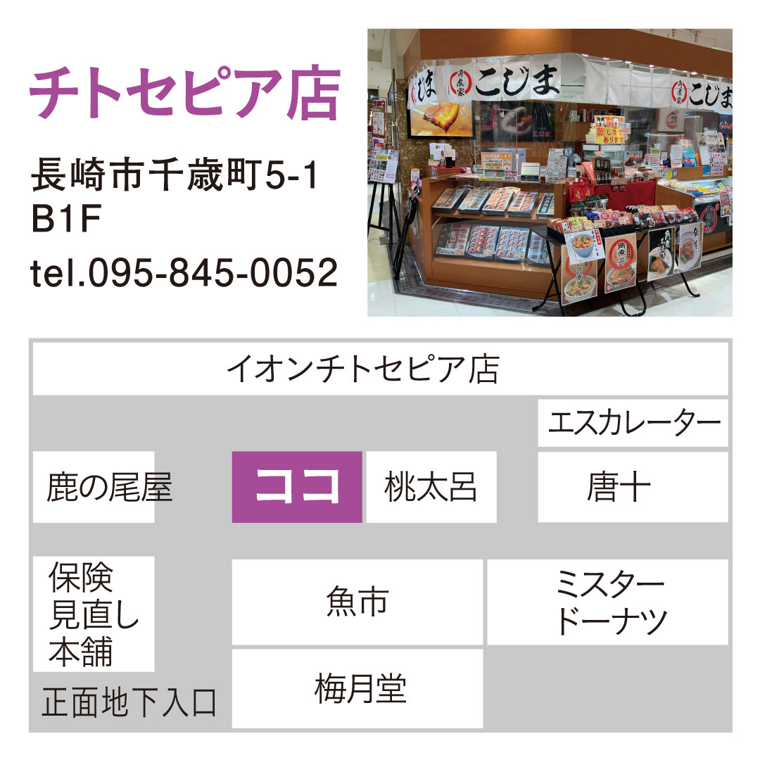 長崎市千歳町にある地元の方々に愛され約30年のショッピングモール「チトセピア」の1階にお店があります。 地元の方々の買い物どころとして親しまれており、ほぼ毎日のようにお越しいただける顔なじみのお客様が多くお越しいただけるアットホームな店舗です。 日々の食卓にもご愛用いただけるような製品も取り揃えており、ハレの日だけでなく普段使いのお店になれるよう心掛けております。 こちらも店頭で「蒸し販売」を行っており、お子さまやお母さまのおやつやちょっとした腹ごしらえに親しまれております。