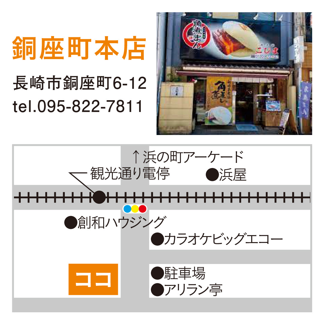 割烹こじまから歩いて5分程度のところに角煮家こじまの直営店「銅座店」があります。 角煮家こじまの各商品はもちろん、店舗でしか取り扱っていない商品も数多く取り揃えており、知識豊富なスタッフがお客様のご要望やご質問に真摯にお応えさせていただきます。 店頭では、せいろによる角煮まんの「蒸し販売」もおこなっており、テイクアウトでお楽しみいただけます。国内外からの観光客の皆さまや修学旅行生の皆さま、そして地元のお子さま連れのご家族など気軽に角煮まんをお楽しみいただけます。